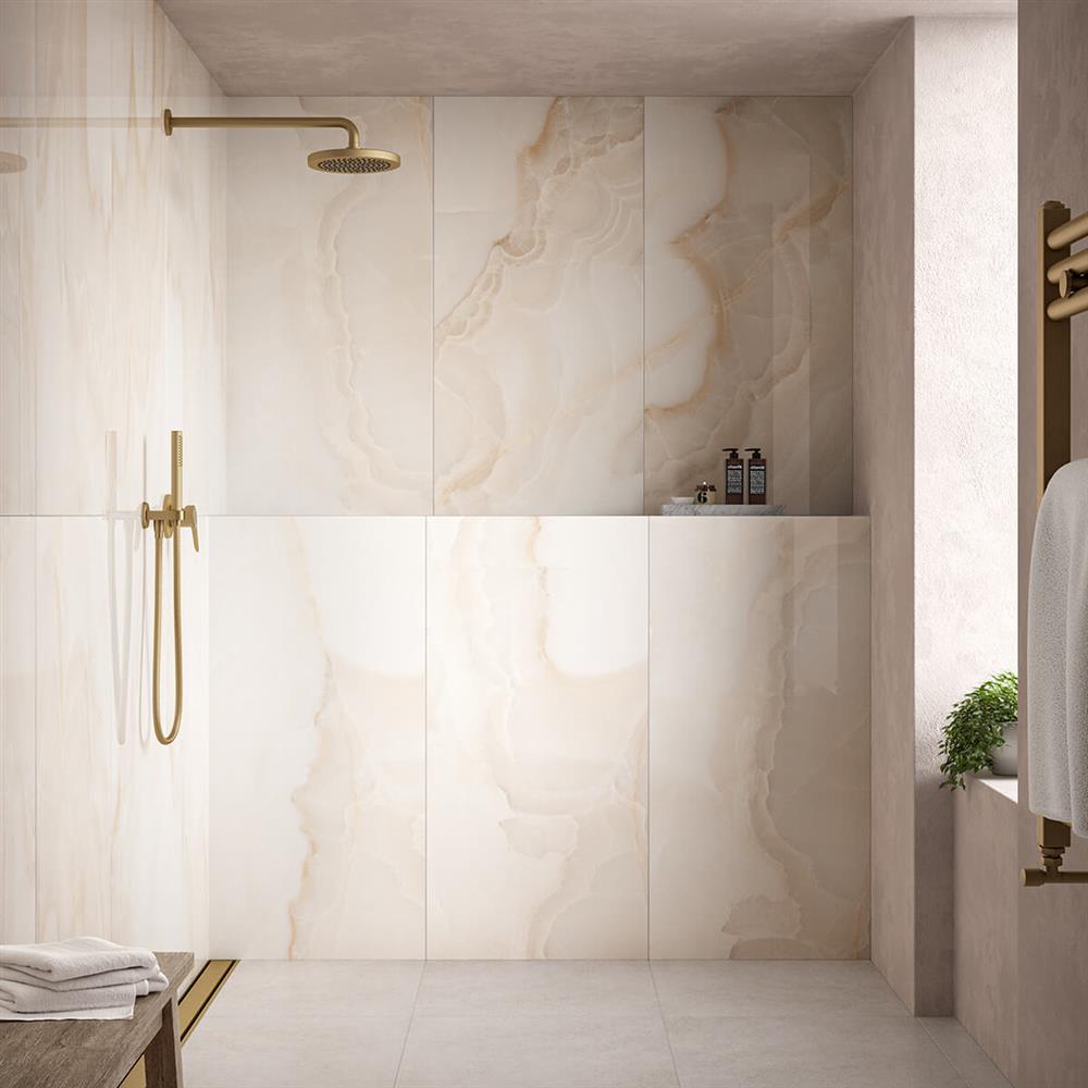 Left: Kit Kat Fern Tiles, Right: Symphony Azul Polished Onyx-effect Porcelain