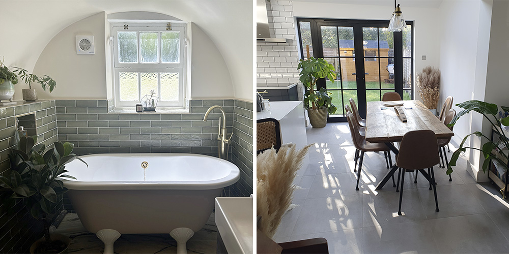 (Left) Vertical Salcombe rose crackle metro tiles, (Right) Horizontal Cavendish teal metro tiles