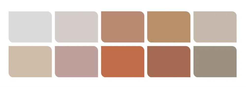 A picture of a calm colour palette, including 10 shades varying from light pink to grey and dark blue