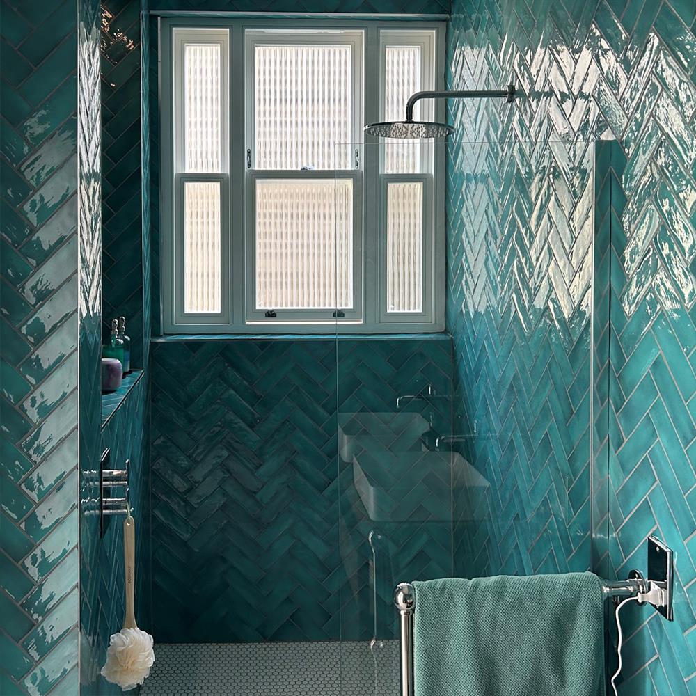 For those seeking traditional green tile bathroom ideas, if you’re more inclined towards creating a space with a uniform colour palette, consider a classic brick-bond or herringbone metro tile layout bolstered by matching accents and grouting.