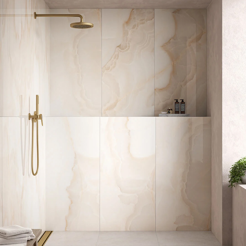 Marble-effect and lightly textured tiles, as well as gentle veins in natural stone porcelain tiles, provide an element of detail while achieving the same goals of creating more space inside.